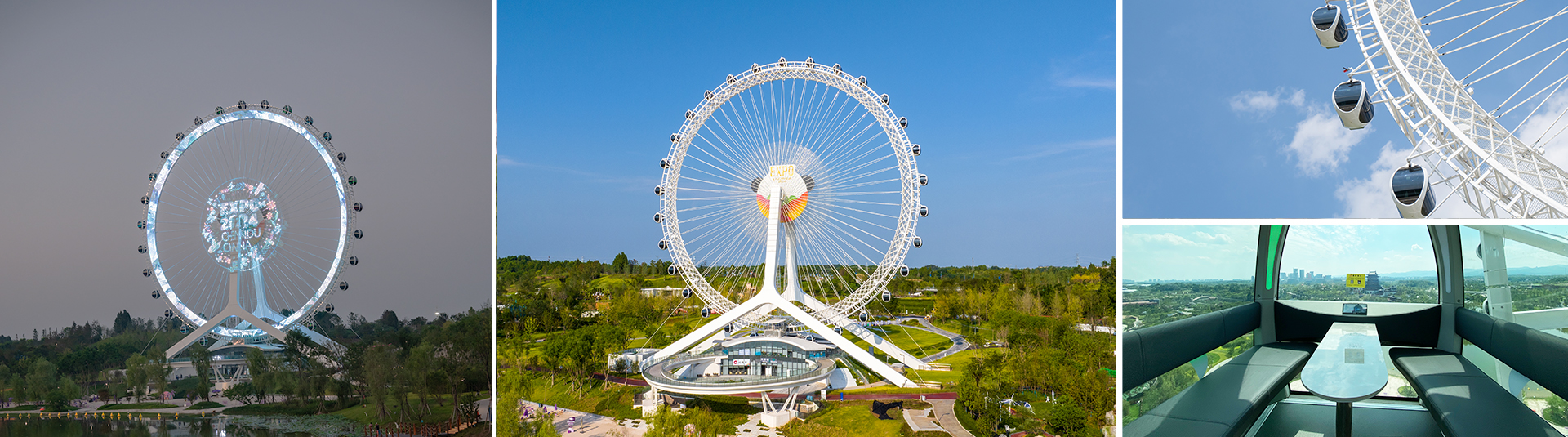 觀覽??架主??為?字形結構,轉盤為全纜索結構,由滾道和鋼纜組成。整體結構科學合理,外觀簡潔??,充滿了科技感與?量感。觀覽?設置了30個轎廂,每個可載客8?。為了增添游客的舒適度,轎廂還配備了空調(diào)系統(tǒng)、藍??響、?線對講機、氛圍燈及內(nèi)飾座椅,在保障安全性的前提下,更具現(xiàn)代感,也更加?性化。