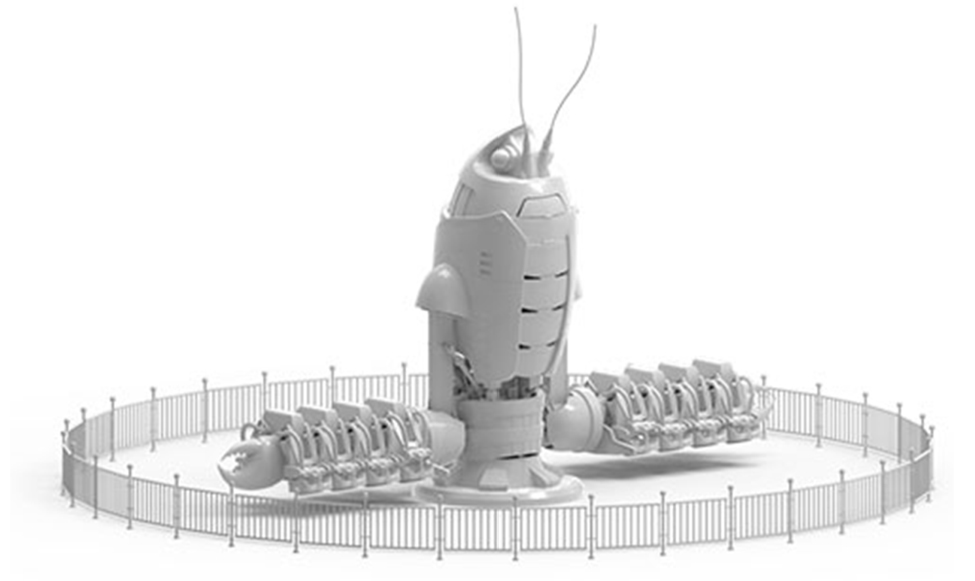 JQJ-16A巨鉗戰(zhàn)甲,設備結構較新穎,體驗感驚險刺激。開始運?時設備主體先上升,上升到?定?度后,進?公轉并伴隨著座艙的?轉和升降臂的升降。整體包裝設計采?機械?蝦造型,標志性的?蝦紅配?加上煙霧、燈光的效果,帶給游客歡樂、刺激的體驗。
