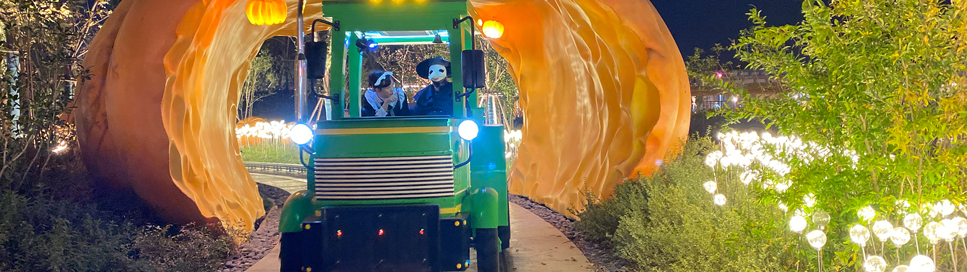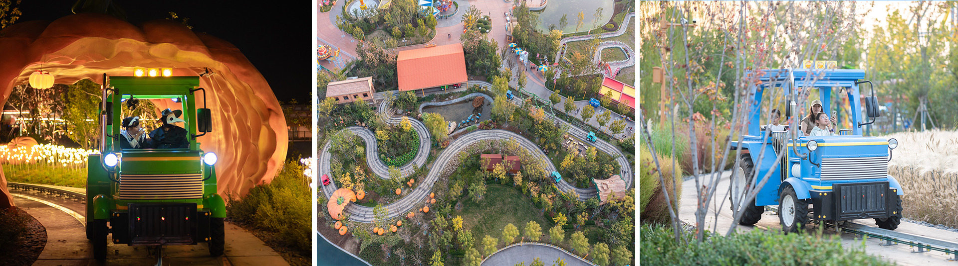 軌道拖拉機是?款模擬真實拖拉機造型為主題的???類型的設備,?輛外觀造型酷炫,?彩鮮明,?輛內飾模擬真實的拖拉機,孩?可以通過把玩?向盤,?動撥桿等部件體驗開拖拉機的感覺,豐富孩?的認知,增加觀光游玩的趣味性。每輛?設置四個座位,前排為?童座,后排為成?座,拖拉機穿梭在美麗的景區(qū)?景中,在欣賞美景的同時共享天倫之樂。