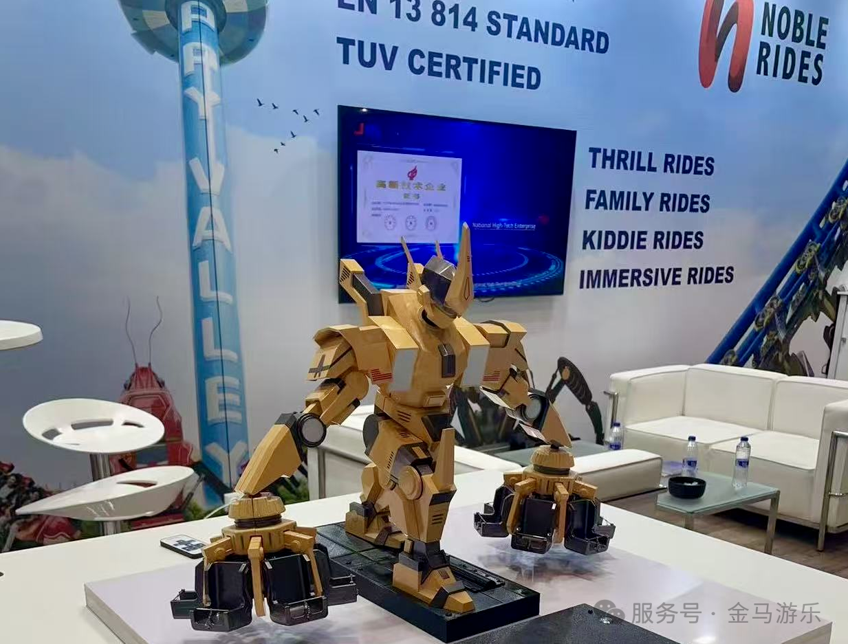 展臺(tái)現(xiàn)場(chǎng),金馬游樂及旗下瑞士子公司Noble Rides的多款創(chuàng)新產(chǎn)品成為全場(chǎng)焦點(diǎn):為德國(guó)客戶量身打造的移動(dòng)懸掛過山車、符合國(guó)際安全標(biāo)準(zhǔn)的全景大橋廂摩天輪、面向家庭游樂市場(chǎng)的機(jī)甲互動(dòng)系列等,吸引了大量專業(yè)觀眾駐足體驗(yàn)。值得一提的是,金馬游樂在歐洲的首套過山車項(xiàng)目計(jì)劃于2026年完成交付。